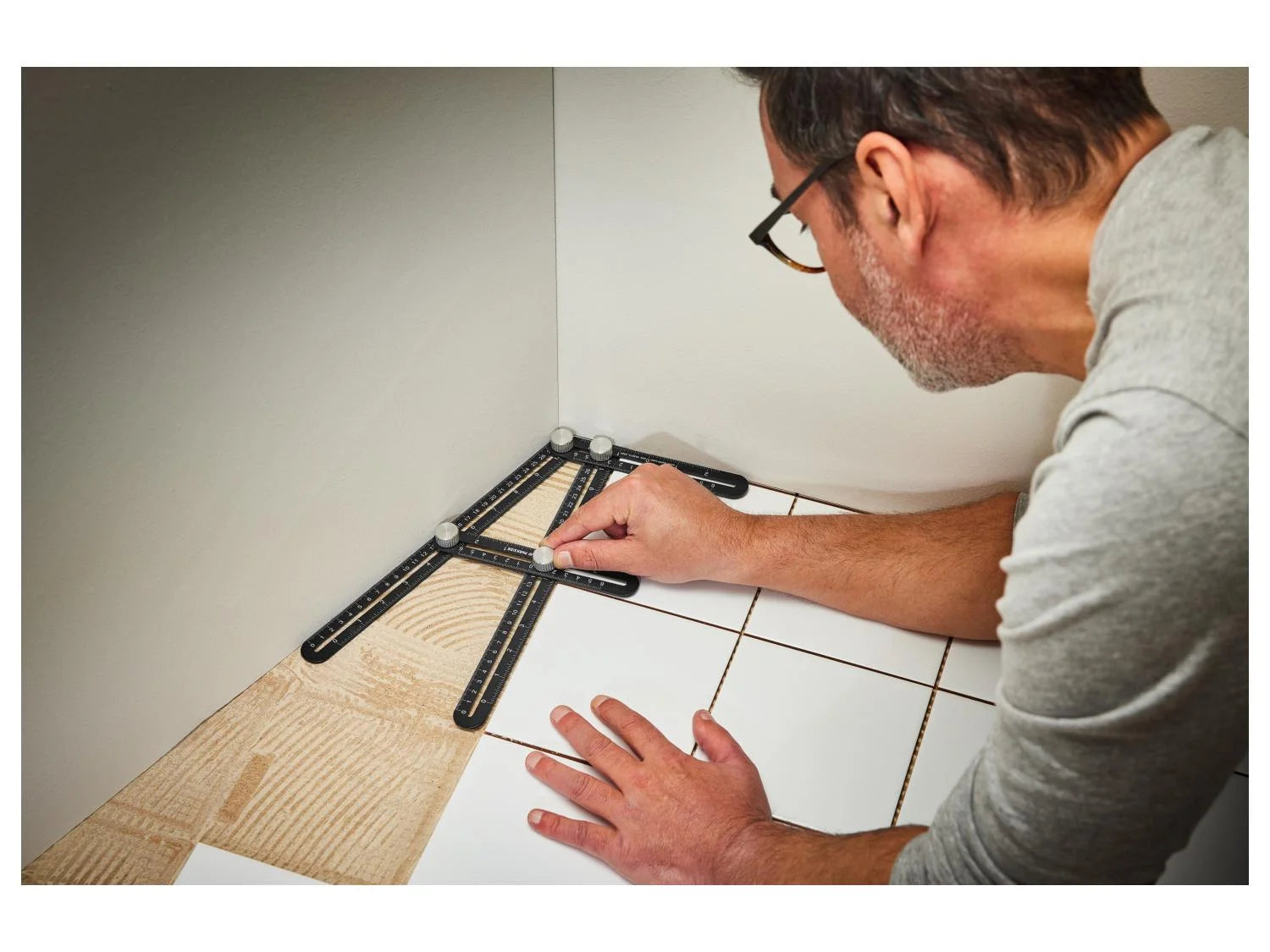 - With 4 adjustable rulers – for measuring angles and shapes in bricks, stones, tiles and all materials with angular shapes