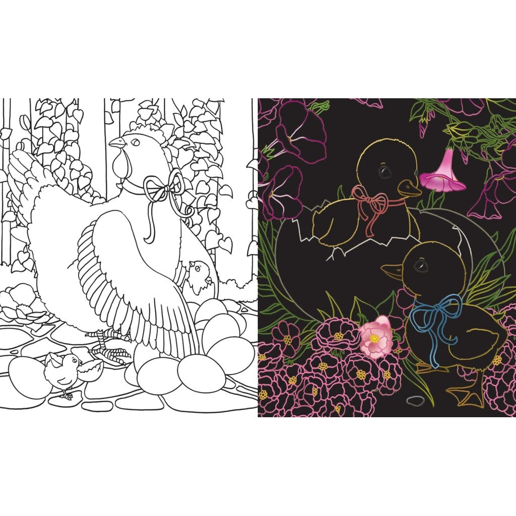باستخدام القلم الخشبي، اخدش الطبقة السوداء لتكشف عن أرانب وحملان وفراخ، بالإضافة إلى الكثير من البيض متعدد الألوان. اكشف عن هذه التصاميم كما يحلو لك، كليًا أو جزئيًا، وخصصها بنقش زخارف مختلفة على الطبقة السوداء.