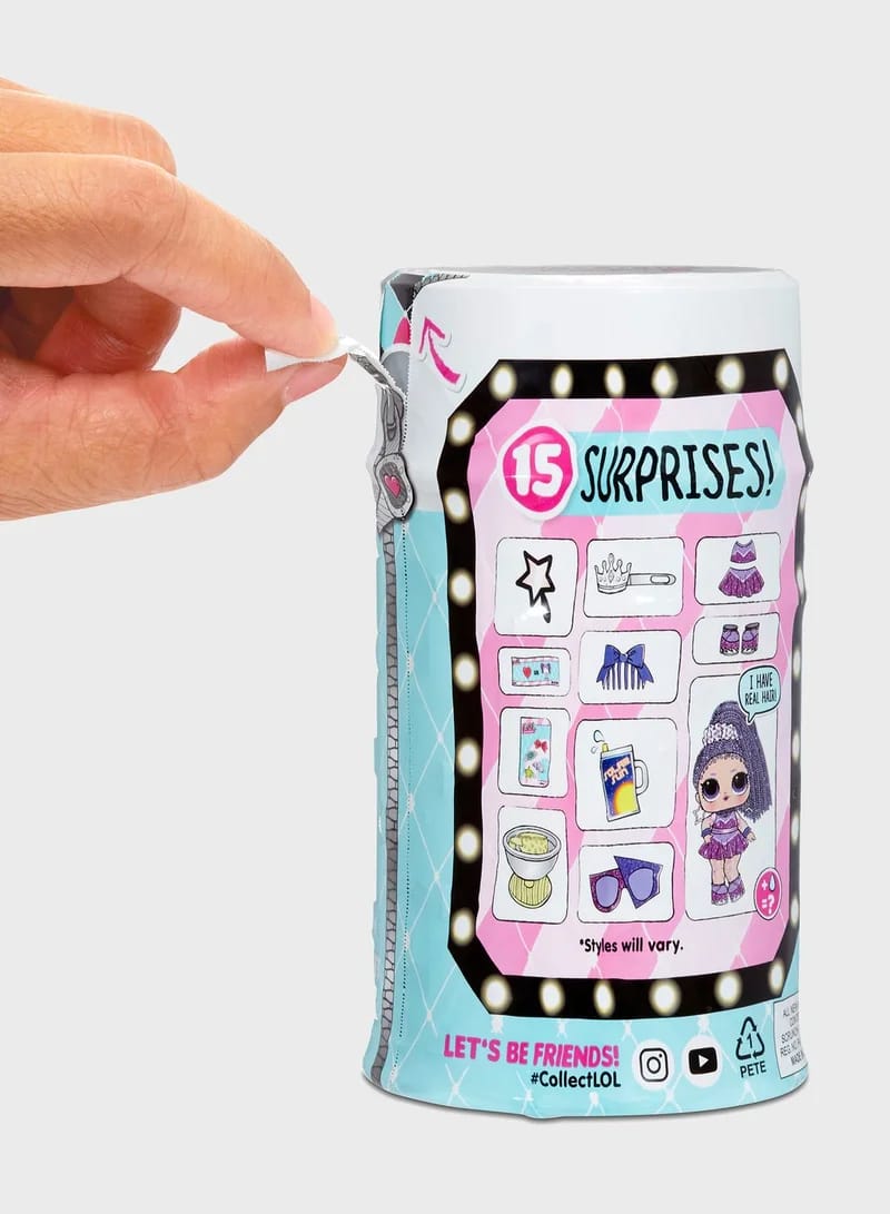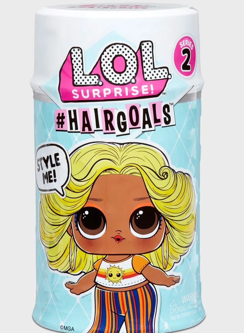 Unbox a mega-cool surprise doll with real hair with the L.O.L. Surprise! #Hairgoals Series 2. Unbox the adorable hairspray packaging to discover a hairspray can containing 15 surprises, including a surprise doll. Each doll is a BRAND NEW, adorable collectible character with mega-cool style and fabulous hair. Unbox her fashions and accessories, dress her up in all her clothes, and show off her fabulous style. Each doll comes with a comb and hair accessories to style your doll's hair. And each doll has a color-change effect—dip the doll in water to reveal a surprise. The hairspray packaging also doubles as a salon playset and a display for your doll. Collect all 9 characters from the L.O.L. Surprise! #Hairgoals Series 2.