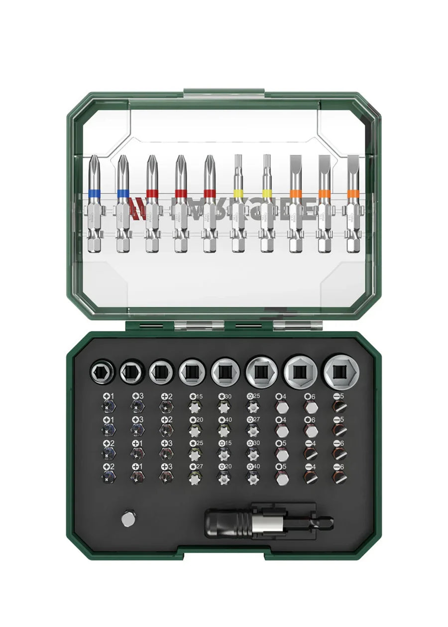 Color-coded bits for common screw head profiles in the most important sizes