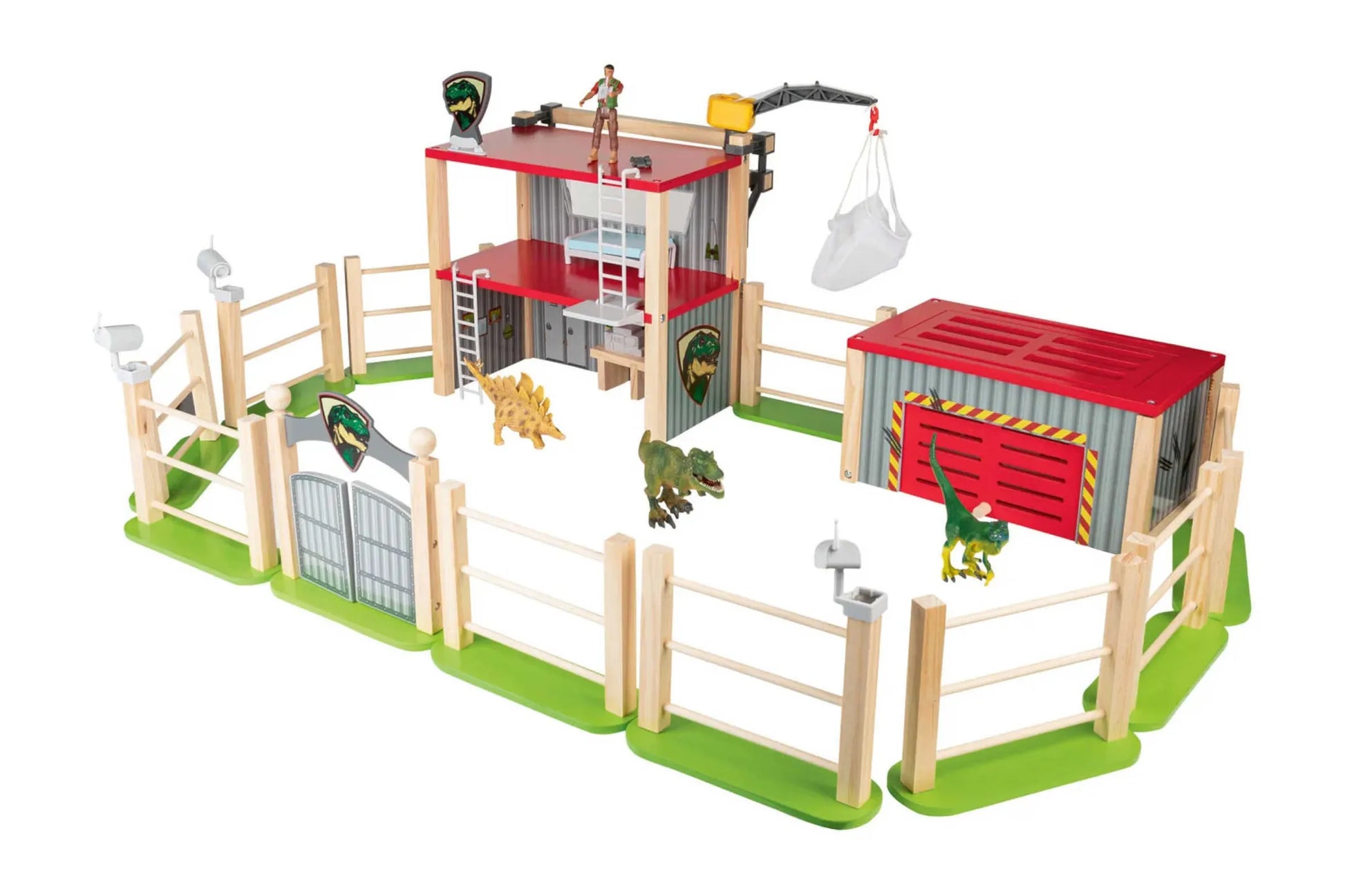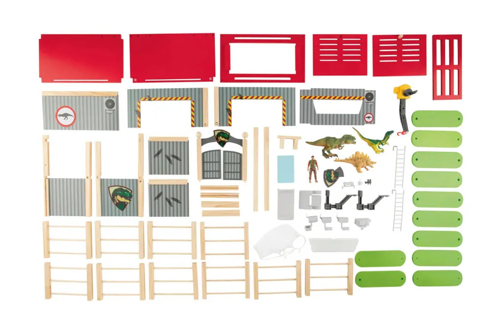 Detailed and lifelike replica 26 pieces: 1x research station, 1x dinosaur cage, 1 x jib crane, 1x gate, 10x fence elements, 3x dinosaurs, 1x researcher, 1x bed, 1x table, 1x monitor, 1x cell phone, 1x binoculars, 3x surveillance camera Including mounting material