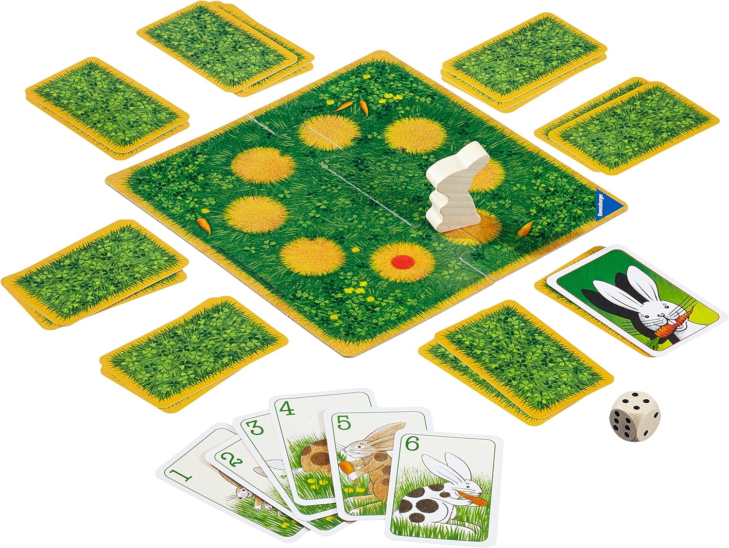 In the Ravensburg game Max Mümmelmann, each player tries to collect a family of rabbits. But it's not so easy to bring a whole bunny family together, because the cheeky Max always messes up. First it is time to roll the dice and draw, the rabbit Max is moved as many spaces forward on the board as the dice shows eyes. Then a card is drawn from the pile where Max is located. If Max appears on the card, you get a card from the other player.